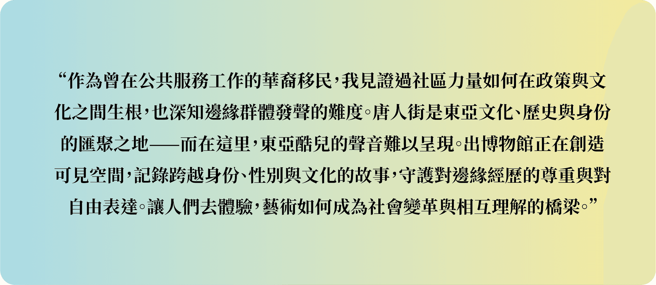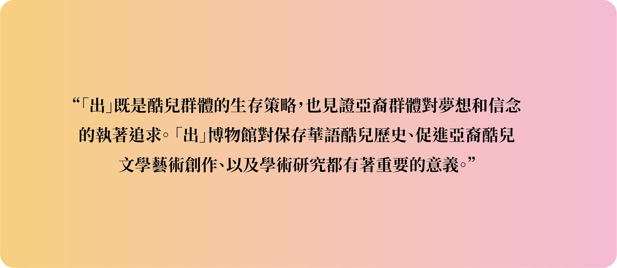 華語世界的同性戀、雙性戀、跨性別及酷兒(LGBTQ)經歷長期被忽略,許多作品和物件散落各處甚至消失。|出|博物館以「華語脈絡」為核心,致力於保存華語視野下的酷兒創作、生活軌跡、社會運動與文化生產。它也重新聚合LGBTQ華人、華人移民及離散社群的藝術、文獻和故事,成為跨地域酷兒經驗的橋樑,讓不同世代的生命經驗互相串連。更重要的是,它將社群記憶轉化為公共呈現,使華語酷兒的歷史得以流動,並在此過程中建構並反思當下敘事,為未來提供靈感,讓社會每個人都能找到理解、對話與共鳴。